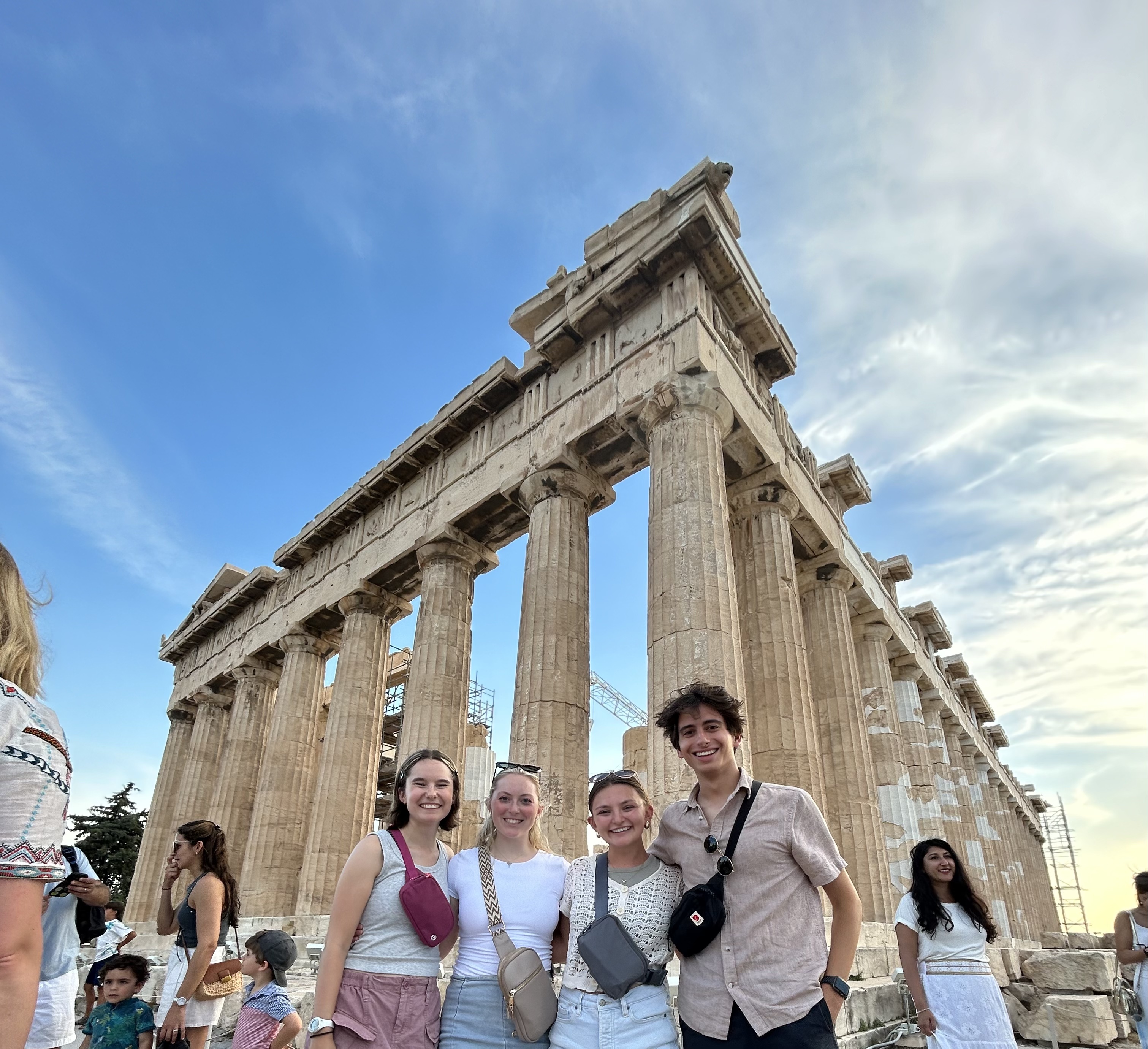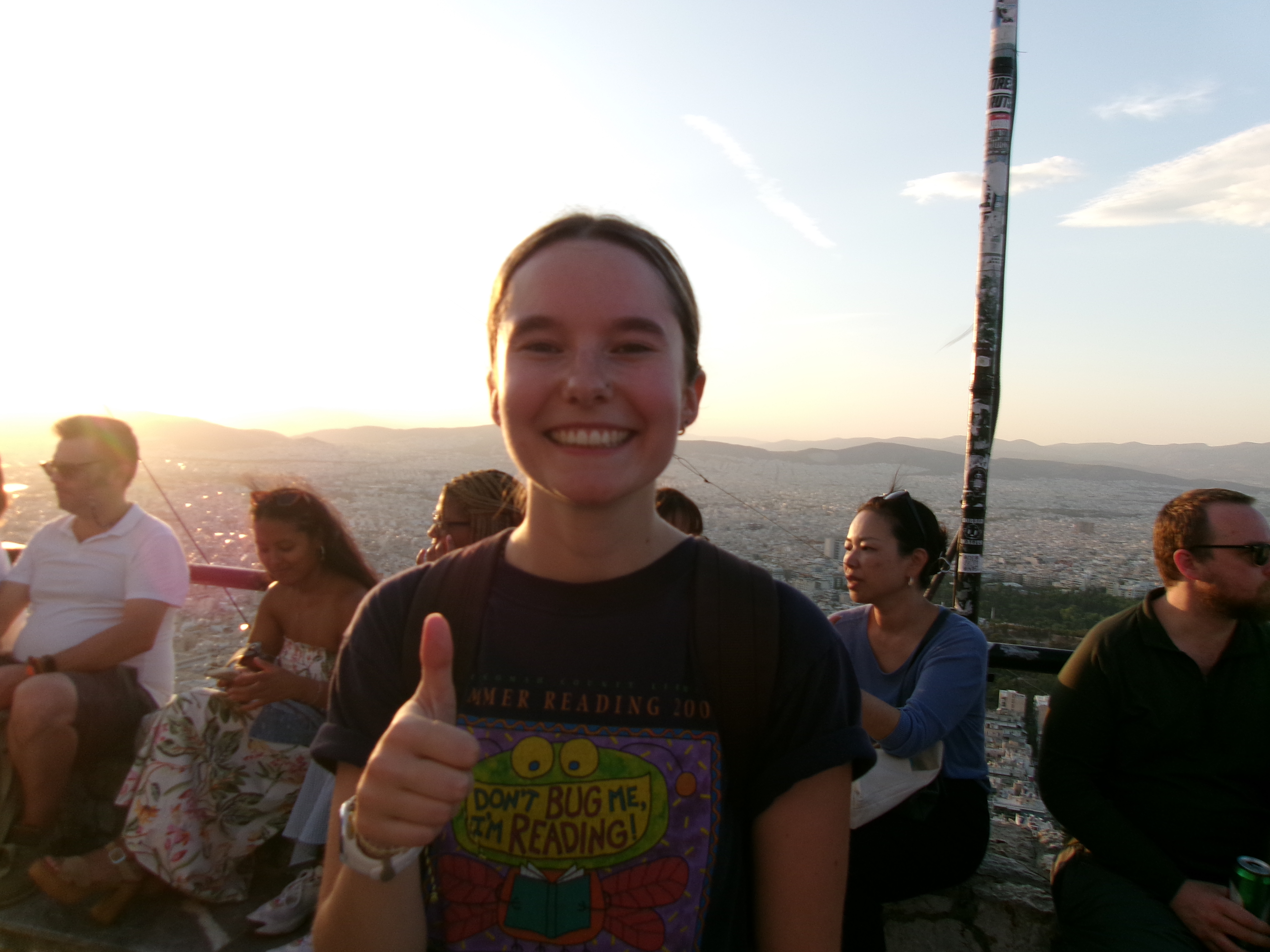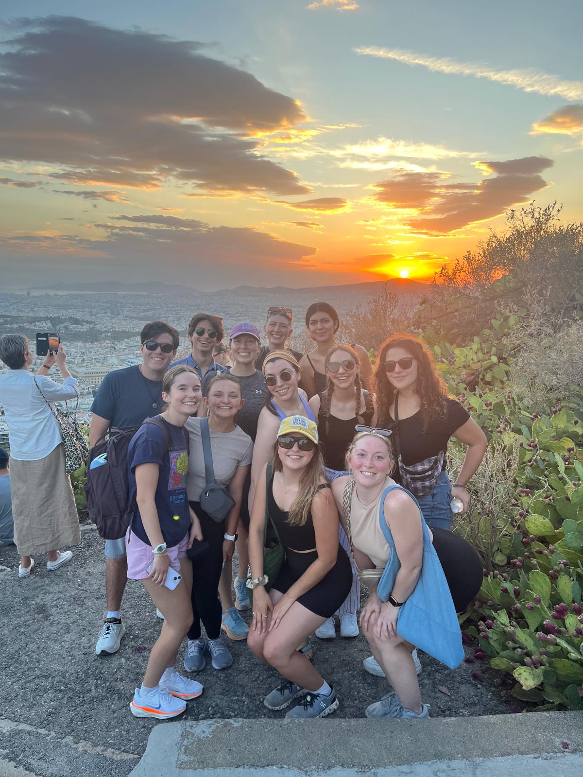 Left top: The view of Athens from the hike up. Left middle: me at the top. Left bottom: the view of the chapel from the hike up. Right: (almost) everyone in my cohort near the top of the hill!