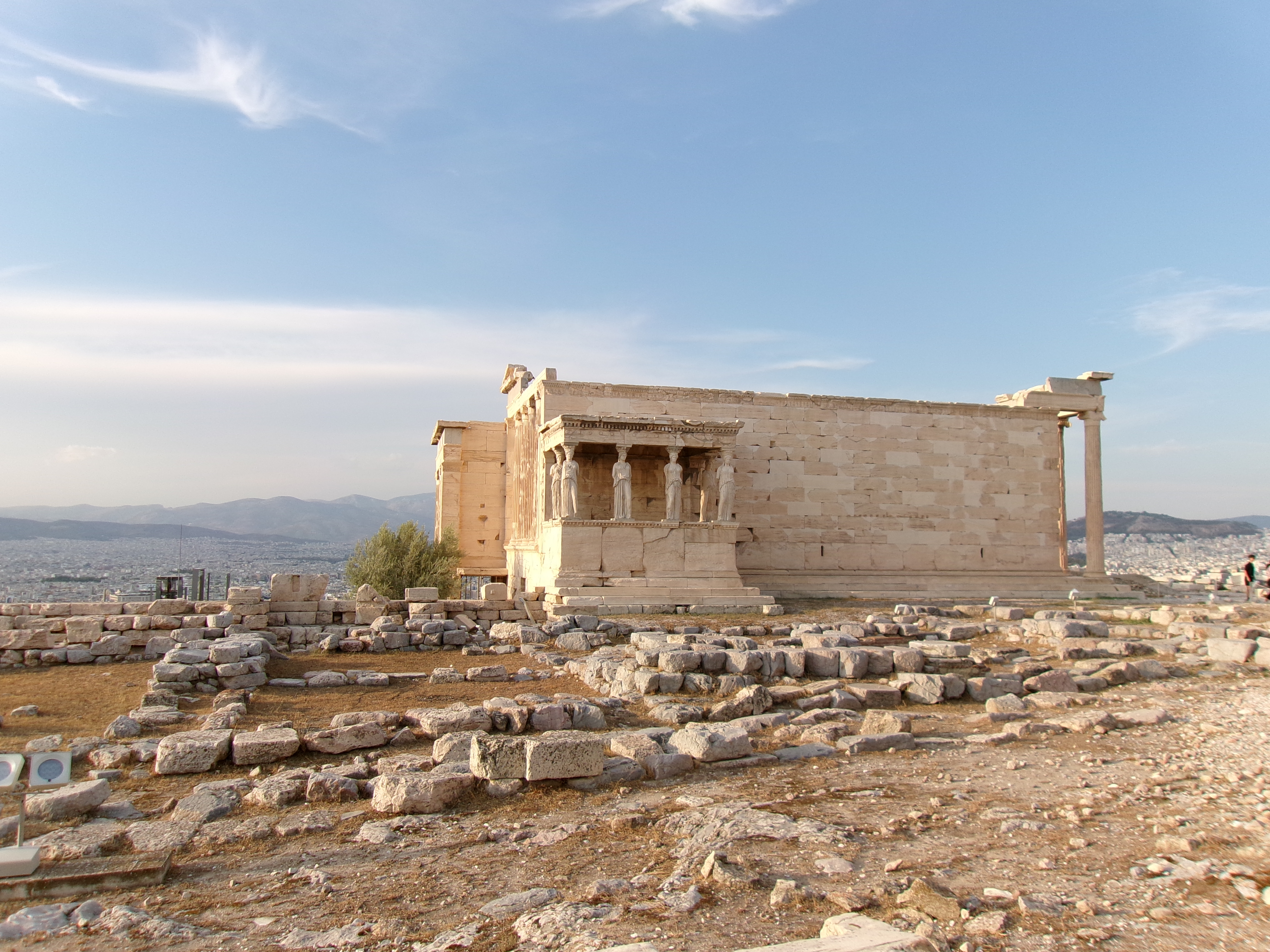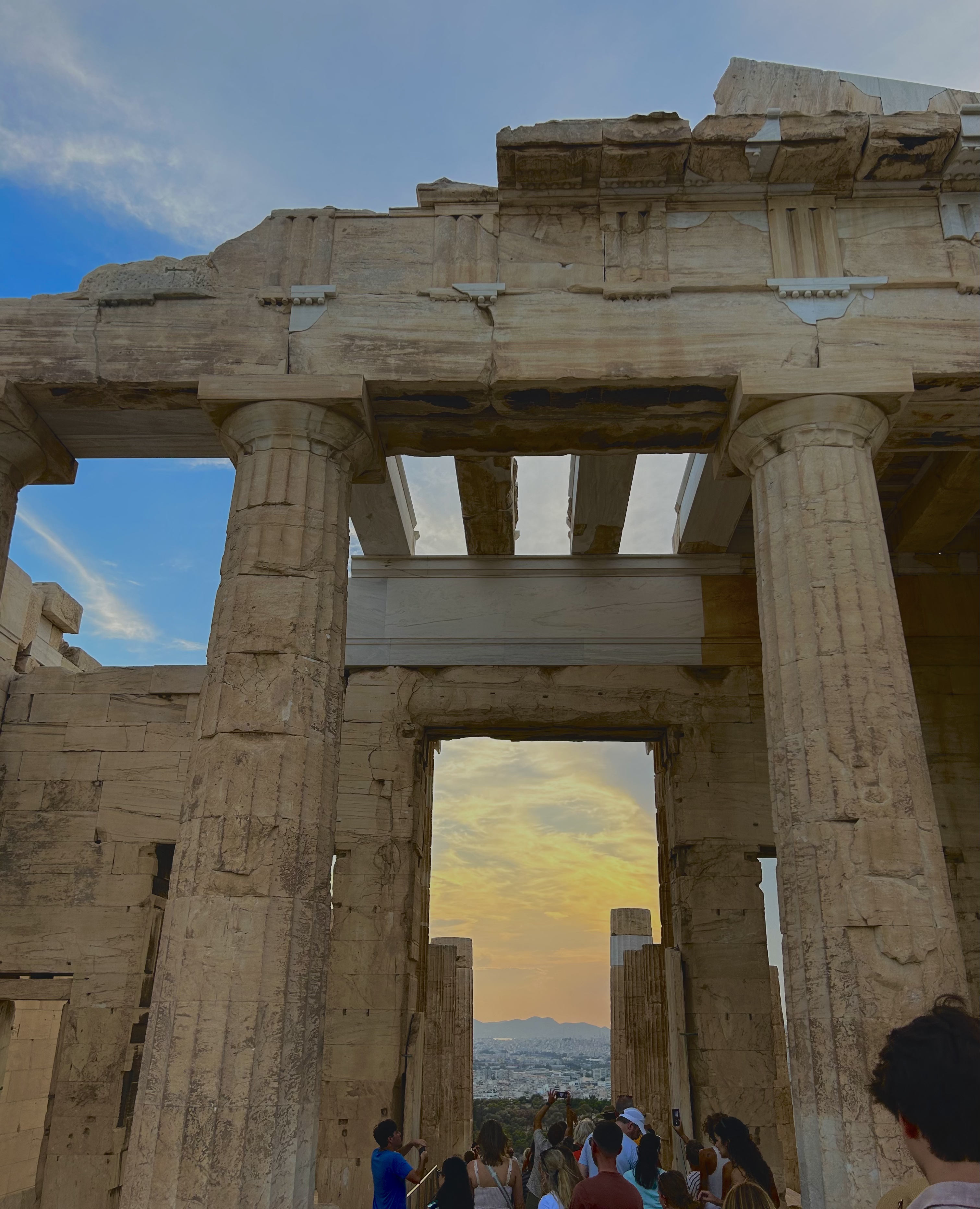 Left top: the view of the acropolis from a viewpoint next to it. Left bottom: sunset through the ruins at the acropolis. Right top: a group of us in front of the Parthenon. Right middle: the temple of Athena Nike. Right bottom: the theater Odeon of Herodes Atticus.