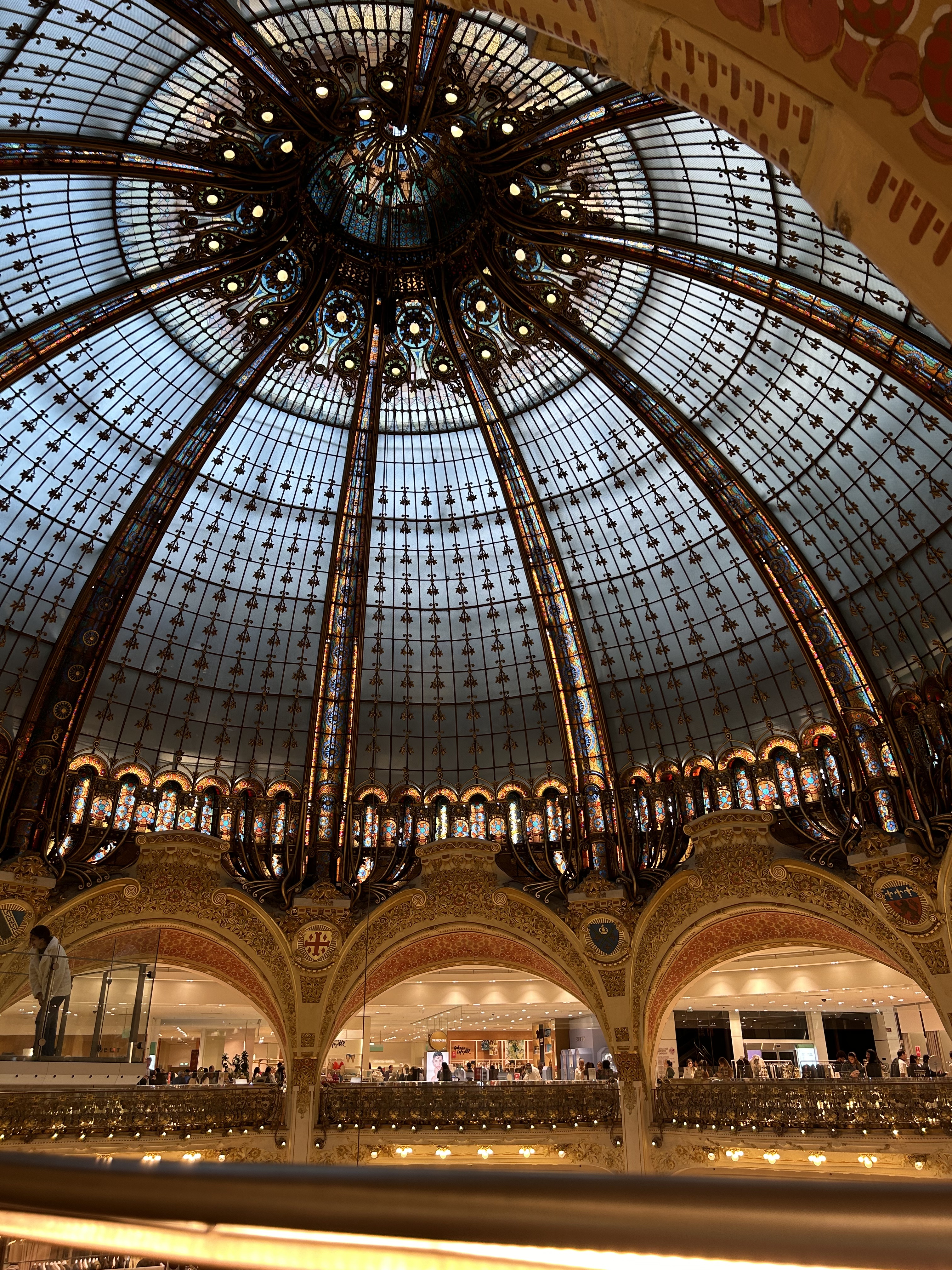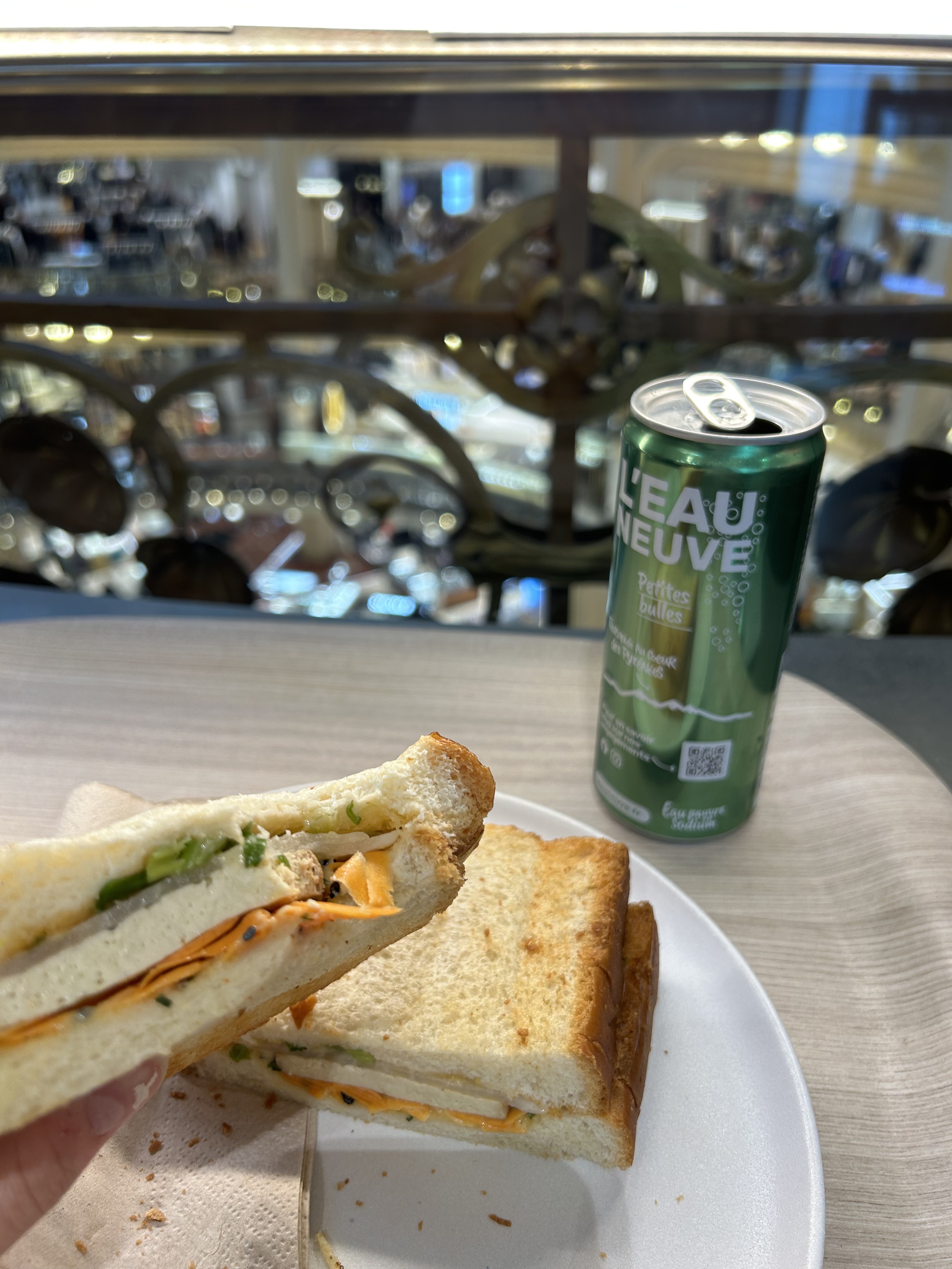 When planning this trip, I listened to a Rick Steves podcast about Paris. In the podcast, he recommended eating at one of the various food courts throughout the city, which have recently become mini culinary destinations. This seemed like a good solo-meal endeavor, so I decided to check out the food court in the Galleries Lafayette. This mall was nothing short of stunning. With domed, stained class ceilings, it felt like entering a very crowded, historic church. I made my way to the food court on the seventh floor and ate a delicious tofu sandwich, while enjoying a nice view of the mall.