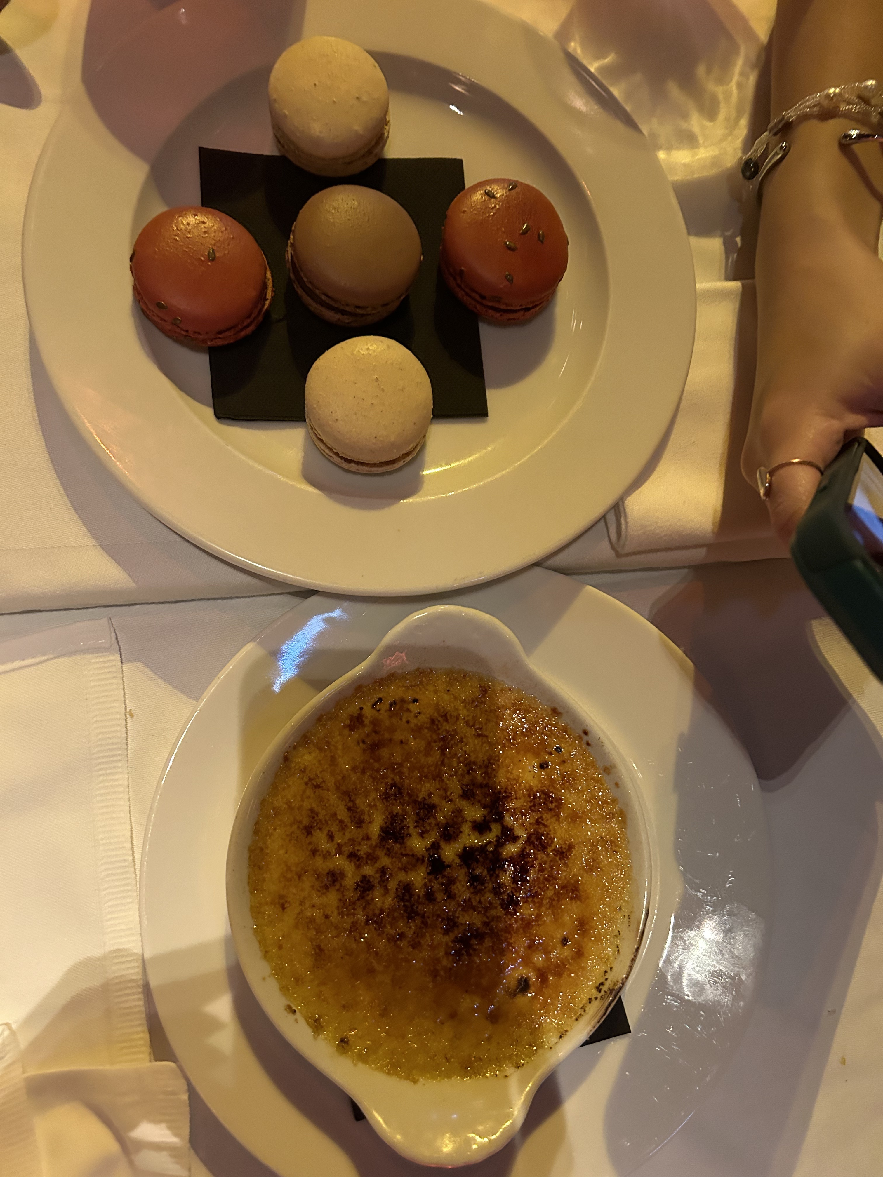For dessert, we split creme brulee and macarons. Both were delicious. Then, we dashed to the Eiffel Tower, hoping to see the lights go out at midnight. The twinkling lights were magic against the dark sky, ringing true to Paris’ second nickname: the city of lights.